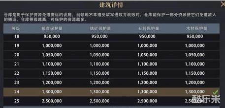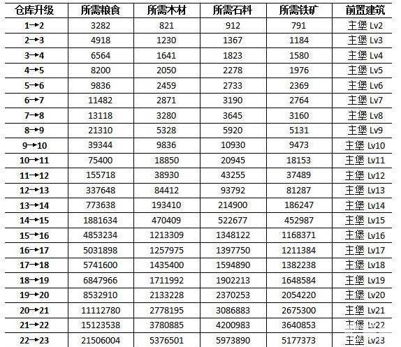 仓库的每一级升级都需消耗一定的粮食、木材、石料与铁矿资源,并要求其前置建筑主堡等级在其之上。领主们通过资源田采集、野外掠夺等方式即可获得仓库升级所需的资源。