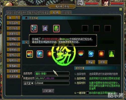 玩家选择宠物后,需选择天生技能或研发技能其中一类,进行突破。玩家可以使用元宝或宠物技能突破令进行突破。如果使用元宝,则会以当前货栈的价格购买一个宠物技能突破令,再进行突破,同时需要花费一定金额的游戏币,放入的宠物有普通、变异、神兽的不同后缀之分,所需游戏币的金额也不同。