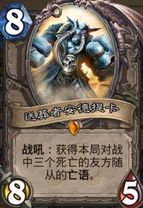 做了这么多的铺垫,如果这样还没有磨死对方,那么就到了终极卡出场了,送葬者安德提卡,因为我们的牌组里只有复生大盗(外加一张丧钟机器人)有亡语效果所以基本上送葬者安德提卡能获得的就只有复生大盗的亡语效果,在送葬者安德提卡被杀死的同时,复制的三个亡语效果直接拉出来三张送葬者安德提卡,确实能给对面带来极大的压力,一般来说一时半会对面也解不掉这样的阵容。
