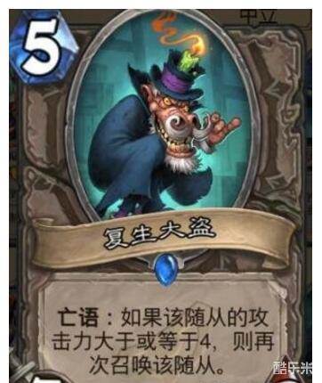 复生大盗依赖于自己的亡语,说白了就是只要增加一点攻击力,这个复生大盗就能再次站起来抗一波。由此非常依赖各种强化卡以及衍生的卡片。