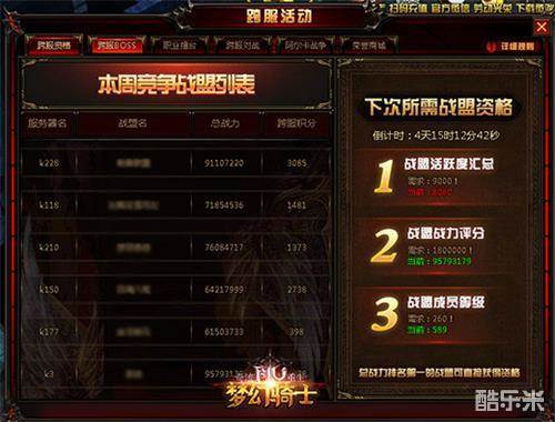 想要加入《奇迹重生:梦幻骑士》的跨服活动,是需要加入一个具备跨服资格的战盟才行的哦!战盟要散“活跃度”、“战力评分”、“战盟成员等级”等三个方面全部达标才能获得资格。特别是“活跃度”指标更是需要全体战盟成员一起努力才能达标的!