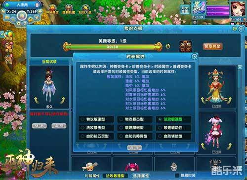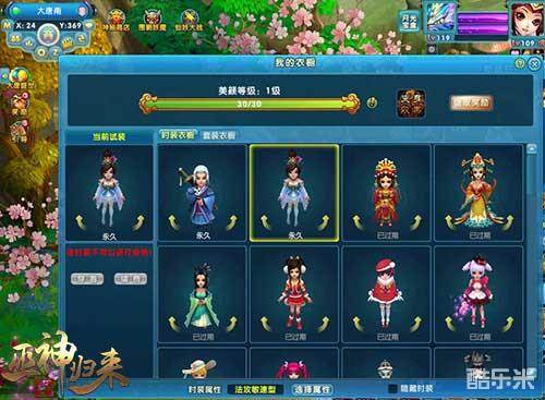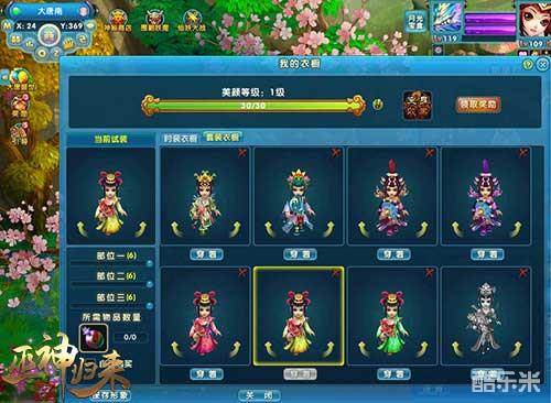 《巫神归来》的美颜系统既是一个时装收集系统,也是一个套装染色系统,更是一个战力加成系统。点击物品栏右上角的时装按钮即可进入“我的衣橱”,玩家收集的所有时装和套装都会展示在“我的衣橱”中。