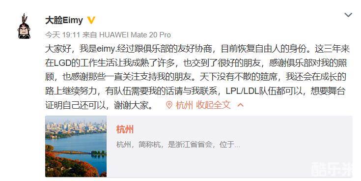 英雄联盟LGD战队官宣:打野选手Eimy正式离队