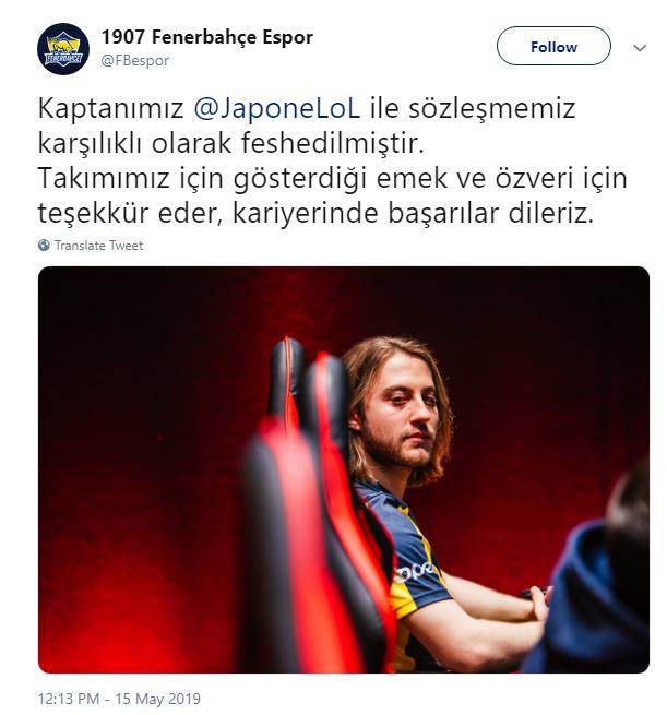 1907费内巴切官宣,队内辅助选手也是队长的Japone合约正式到期: