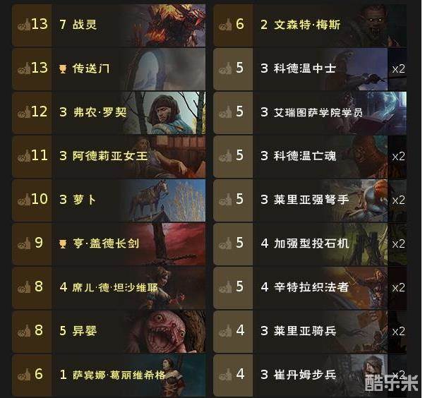 铜卡:科德温中士、学院学员、加强型投石机的数目可自行调整,保证总数为5即可。