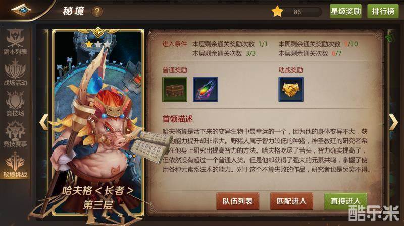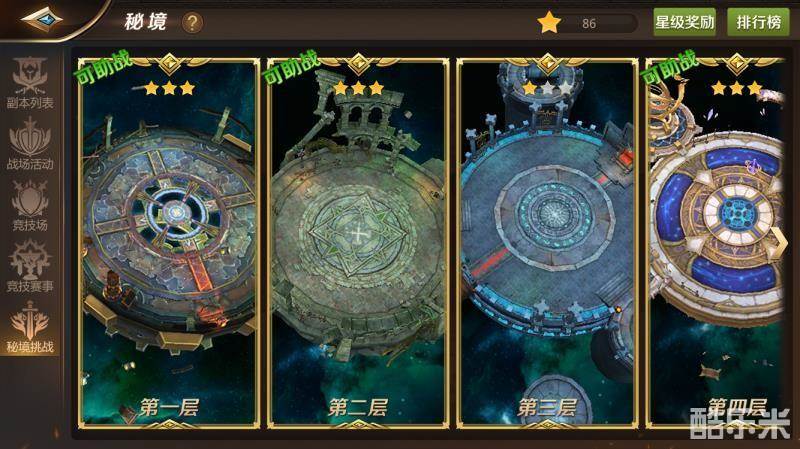 目前秘境挑战玩法仅对70级及以上的冒险家开放,符合条件的玩家可通过“征战”界面中的“秘境挑战”页签进入。秘境副本全天开放,每层挑战副本可匹配或组队直接进入,队伍成员需均通关上一层并且均拥有通关次数方可开战开始挑战。秘境副本击杀所有BOSS,会根据达成不同的条件会获得1星至3星的通关评价,每周根据所获得的总通关星级可获得额外周奖励。3星通关所选层且有剩余助战奖励次数的角色可进行助战,助战次数和通关次数一样每周会重置。