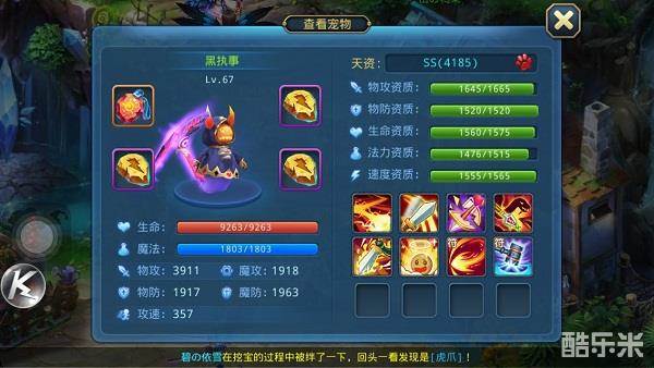 我们再来看看iOS一区盛世奇缘的强力南瓜君——黑执事!虽然比上一个少一个技能,不过资质成长都快赶上前面的全服第一南瓜了。但是它少了一个南瓜君独有的善恶审判,有那么一丢丢可惜。不过有一个高级神佑,也不错啦!