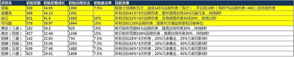 首先看看游戏中远程输出武将的属性对比: