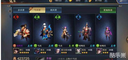 随意弄的弓兵队,肉盾用的还是曹仁,其实上华佗更好,但我华佗战力碾压了,没参考价值就换了一套战力稍低的阵容。