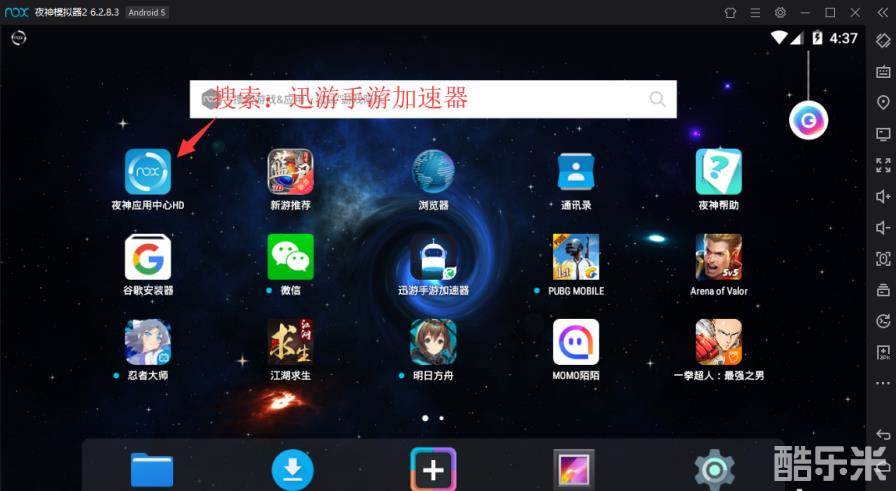 2. 模拟器内搜索迅游手游加速器下载并安装