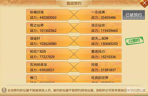 因此,与盟友商量本周盟战的策略,进而选择最优的对手,往往是排名逆袭稍纵即逝的机会。《剑逆八荒》跨服盟战的预约一一对应,被预约的仙盟将丧失选择对手的主动权,而主动预约的仙盟亦可消耗一定的盟战积分抢夺心仪的对手,这就考验各位盟主的手速了。