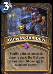 史诗品质,三费盗贼职业法术,效果是分别将两张“子弹”牌,洗入双方的牌库,率先抽到“子弹”牌的玩家将会对对手造成10点伤害。非常经典的俄罗斯转盘玩法,运气在其中所占的成分永远不会小,不过如果能稳定触发的话,横向对比牧师的心灵震爆,性价比要高很多。总的来说,这张牌对于携带糯米大厨的节奏贼来说是一张非常强效的增强卡,但是我们要考虑的是,是否要为了额外的十点伤害,而在三费阶段放弃场面。