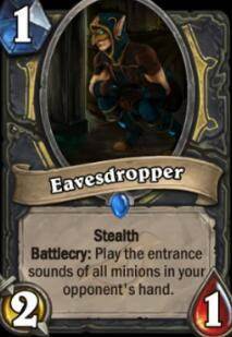 稀有品质盗贼职业卡,一费,2/1身材,潜行,战吼:播放你对手手牌中所有随从的登场音效。乍一看貌似是一个娱乐卡,但是仔细想一下却是和变色龙一样的偷窥卡,并且偷窥效果异常强力,能够洞悉对手所有的随从,像火车王之类的一下就可以听出来。这张牌在狂野模式的效用性非常高,毕竟狂野模式往往核弹牧,大哥牧傻傻分不清。当然了,其缺陷也是异常明显的,那就是如果你对随从的台词不熟悉就相当于白卡一张。