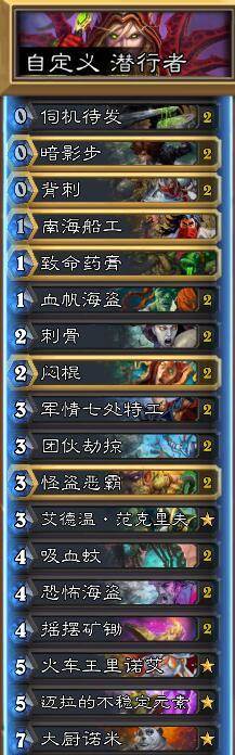 现在环境是节奏贼最多,所以我带的比较针对内战,先后手留劫掠恶霸,先手有劫掠留伺机待发,不然不留,法术偏少随从偏多,易卡手,有恶霸可考虑留背刺;后手有恶霸留暗影步,拉卡差,2费恶霸拿回来防背刺。