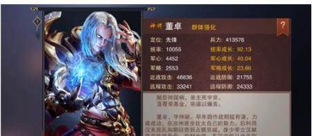 董卓作为吕布的义父,在东汉末年可谓是权倾天下,把持朝政,暴虐非常。在游戏中,董卓同样十分残暴,神将之一的他,自带游戏中最强的单体回复技能,纵祸可以对单体目标造成320%的近战伤害,立即回复造成伤害80%的兵力。董卓在战斗中可谓是越战越勇,尤其是当血量危急的时候,一个大招便能恢复到安全状态,令敌人束手无策...
