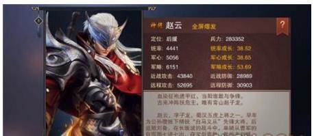 赵云拥有全游戏中最强的资质,在输出方面可谓是无人能够望其项背,论暴力输出,赵云能够达到极致。赵云的核心技能蛟龙出海,能够对全屏的目标刺杀四次,每次造成44%的高额伤害,并且还有高伤害加成以及减伤BUFF,可谓是一举两得。在阵容的搭配上,由于赵云倾向于极端的输出,所以一定要为赵云配备负责防御的武将,只要给赵云一个安稳输出的空间,绝对会让敌人感受到他的恐怖...