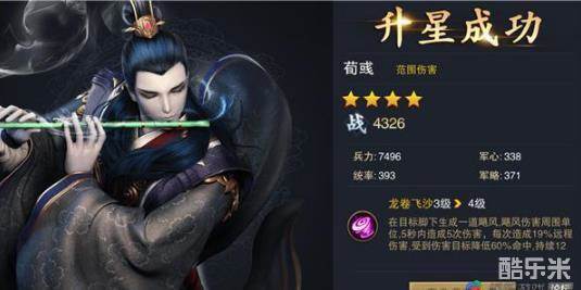 解析:飓风伤害一经释放,搭配其他武将及兵种的输出,一般都会秒掉一位敌方武将。因为荀彧的5次伤害足够高,并且降低命中还会让受伤目标不能准确的进攻自己,从而做到自保,技能持续时间较长也是优势之一。