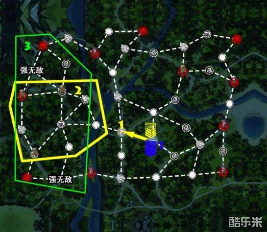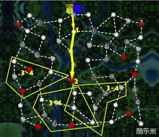 部署说明:一队(黄色)作战开始前,二队(粉色)第一回合,三队(蓝色)第二回合,