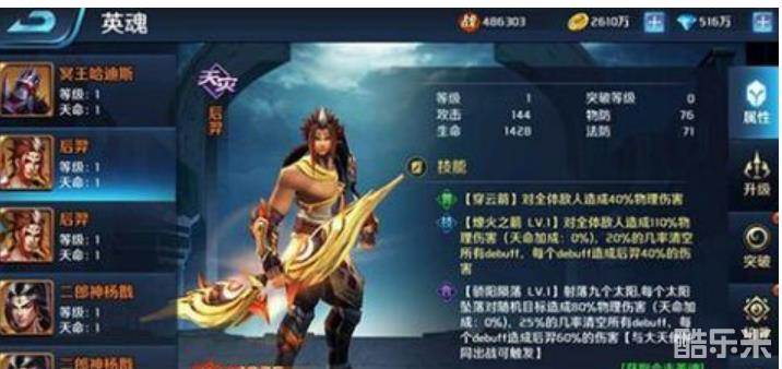 合击技能:【骄阳陨落LV1】射落九个太阳,每个太阳坠落对随机目标造成80%物理伤害(天命加成:0%),25%的几率清空所有负面效果,每个负面效果造成后羿60%的伤害【与大天使共同出战可触发】