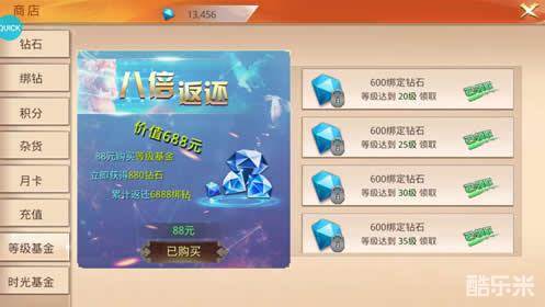 商城里新增了“等级基金”豪礼八倍返还,价值688元的等级基金仅需88元购买,立即获得880钻石,累计返还6888绑定钻石,玩家等级达到相应的等级即可领取600绑定钻石,