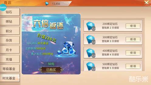 价值288元的时光基金仅需50元购买,立即获得500绑定钻石,累计返还2888绑定钻石,登录累计即可领取超值奖励: