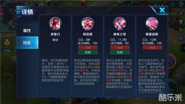 被动-侠客行:在连续的普攻之后,会触发侠客行,短暂解除三技能的封印,同时增加自身的攻击力。因此李白在开团时基本要先解封三技能才进团,也就是先要利用野怪或者小兵,或者在发育良好的情况下利用敌方坦克进行普攻刷出大招。