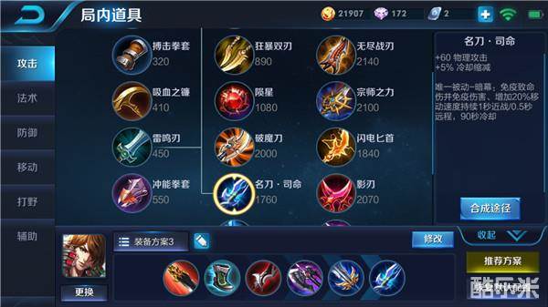 名刀·司命:主要是被动暗幕,可以免疫致命伤,同时增加移动速度,关键时候的保命神器,为了防止李白来不及按二技能或者三技能,然后被一套秒。