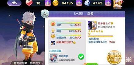 忍者满级后能够跳跃7次,获得装备忍术卷轴,二段跳能够获得大量得分。影分身持续时间达到了丧心病狂的55秒。