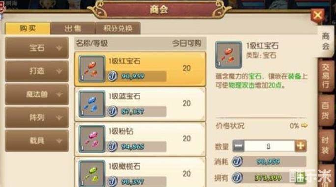 商会购买区里,所有的道具都可以通过银币购买。这些道具大致分为5类:宝石、打造相关道具、魔法兽相关道具、阵列道具和载具相关道具。