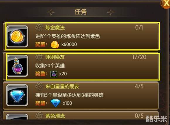 获得新英雄和培养英雄的时候,任务系统里也会有一个专属的奖励提供给我们。我们可以从这一类任务中获得大量的金币和经验药水,甚至钻石。