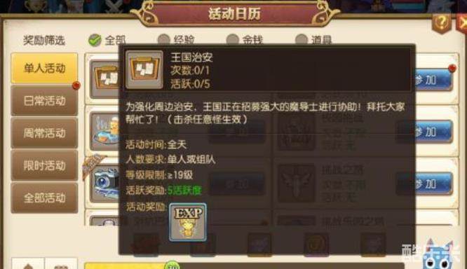 TIPS4:当接取王国治安任务后,并非一定要巡逻打怪才能增加活动进度,参与任意的打怪活动都可以增加王国治安活动进度(如乐园、制服猛兽、驱魔等等各种打怪活动)。