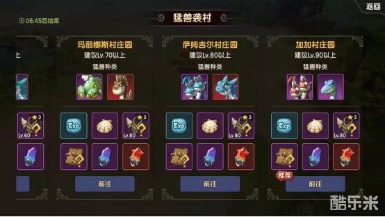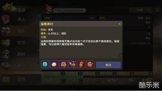 玩家角色等级达到40级后,开启猛兽袭村的玩法,玩家可以通过单人或多人进行挑战,因为不同等级的猛兽挑战难度不同,高等级村庄的猛兽难度更高,建议组队挑战,胜率更高。