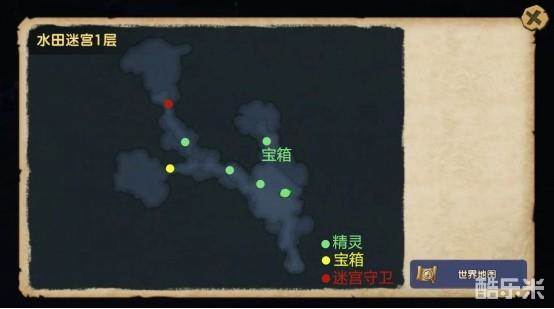 进入水田迷宫每一层都有相应的迷宫守护兽、传送兽、宝箱和精灵。如水田迷宫第一层的各大资源分布图:
