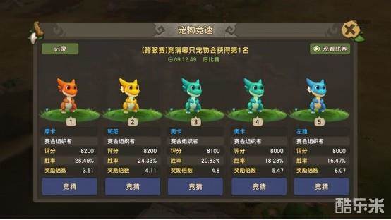周三00:00以一定概率在所有报名的宠物中挑选5只参赛宠物,玩家可以在00:00-19:00前对参赛宠物进行押注,19:00-19:30进入比赛时间,19:30为公布结果和发奖时间。