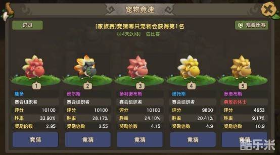 在周三、周五、周日的00:00-19:00时间段,玩家打开[家族]→[活动]→[宠物竞速],可以对五名宠物进行竞猜,竞猜哪只宠物会获得比赛的第一名,不同类型的竞猜押注的类型各有不同。