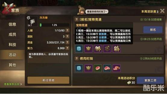 活动流程:每周为单位,周一0:00-24:00宠物预告,周二0:00-24:00报名参赛,周三19:00为家族赛,周五19:00位为全服赛,周日19:00为跨服赛。