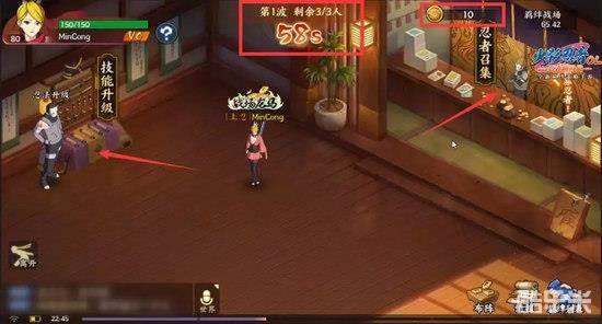 战斗开始前,系统会给予10点初始积分,界面上方会出现倒计时,倒计时结束前,需要在房间右侧“忍者召集”处,消耗羁绊积分,购买所需忍者,以及在房间左侧“技能升级”处,升级技能。