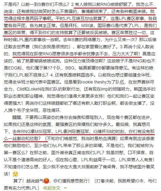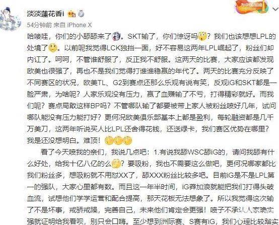 JDG老板的微博原文如下,简单来说,他先表示IG输了自己不舒服,LPL和LCK赛区,这两个赛区和欧美赛区的氛围是不一样的。LPL和LCK这边输了就被狂喷,但是欧美那边赛点了还乐观的有说有笑,就是因为人家没有压力,我们的战队输了要被带上家人喷好几年,欧美电竞环境又好,而且俱乐部舍得花钱,我们赛区在竞争上早就没有了优势。