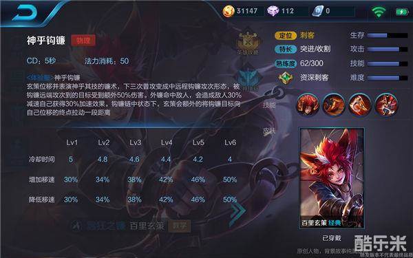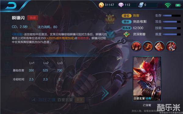 大招——瞬镰闪:该技能钩中后激活,玄策沿钩镰锁链瞬镰闪到对方身后,瞬镰闪的路径上对所有单位造成物理伤害,瞬镰闪过程中玄策挥舞短镰抵挡伤害。