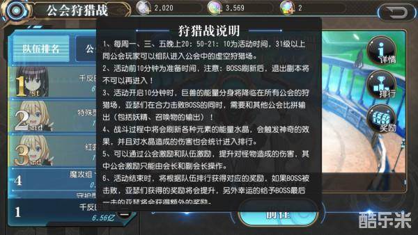 狩猎战也是个简明易懂的活动。公会小伙伴们组成队伍合伙狩猎boss,然后按小队输出排名,按公会每个小队输出的总和来进行公会排名,所以这就是个纯拼输出的活动啦。