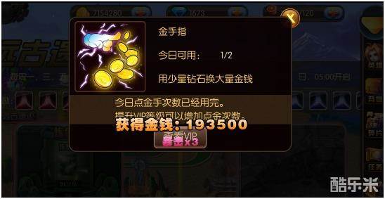 二、金手指。用少量的钻石换取一定的金币。每天第一次是10钻石换64500,有概率暴击,最高10倍,建议每天点一次。