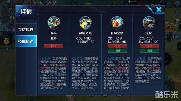 百里守约的三技能增加了一些他的生存能力,技能效果比较类似虞姬的大招,当被敌人近身的时候百里守约可以使用大招来后跳逃跑,技能时候可以打出伤害并且增加百里守约的移动速度。