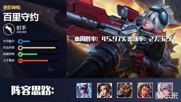 百里守约本周胜率为45.97%,出场率为27.32%。从胜率上来说百里守约目前的胜率较低,上周45.97%的胜率在全英雄中排名倒数第三,而这种情况的发生也与百里守约是个新英雄有着密切关系,出场率上来说百里守约上周排名第11位,反应了玩家对于这个英雄的喜爱程度颇高。