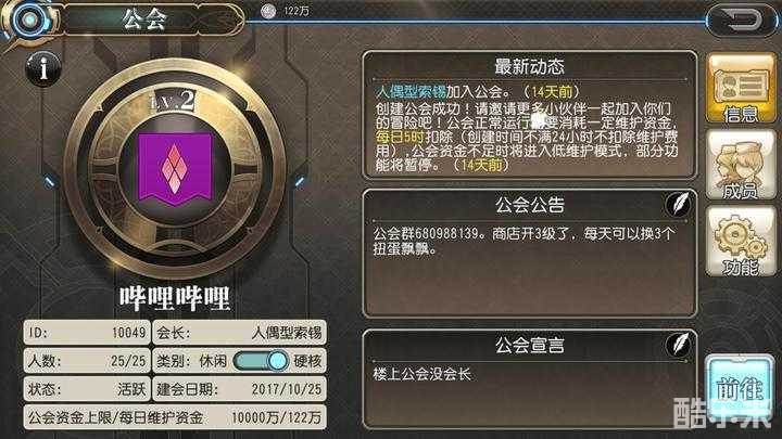最后是公会升级思路,我先升级的补给然后开科技,科技升级补给(对会员好也是对自己好),然后根据情况升级战斗。然后攒钱升25人!!!