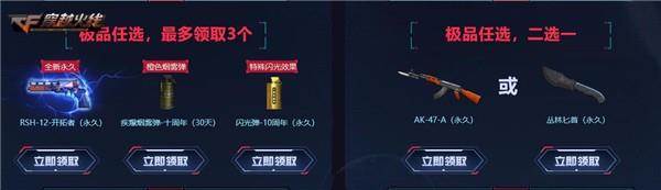 玩家游戏一局,累计2天即可领取全新永久道具RSH-12-开拓者(永久)、疾爆烟雾弹-十周年(30天)、闪光弹-10周年(永久);累计3天即可在AK-47(永久)、丛林匕首(永久)中二选一。