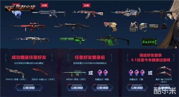 玩家可给好友分享迷你超级礼包,好友领取礼包可获得以下几款惊喜道具。成功赠送任意好友,玩家可领取SPAS12-恶棍(30天)、尼泊尔-水晶之心(30天);任意好友登录后,玩家可领取M82A1-青龙(30天)或觉醒宝石两颗;自4.1日至今未登录过游戏的指定好友登录后,即可在活动页面领取觉醒宝石三颗或鹰爪-情人节2019(永久)。