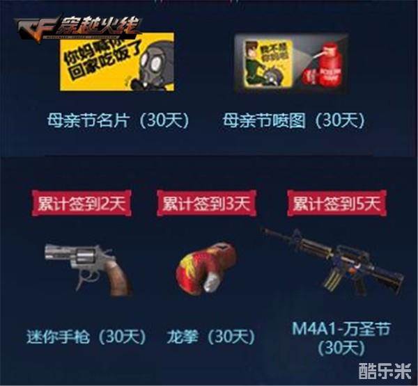 5.10-5.23日,回答戏精妈妈的发问,即可获得母亲节名片和喷漆(30天),累计签到2天可获得迷你手枪(30天)、签到可领取3天(30天)、签到5天可领取M4A1-万圣节(30天)。