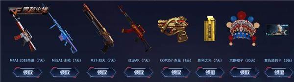 活动持续期间,玩家在活动页面关注CF公众号,领取王者之石、黑龙、高爆手雷-雷蛇等专属豪礼。各平台用户还可以来活动页面点亮属于自己的平台特权,挑选一份心仪的武器道具。本次活动支持包括Tencent Wegame、QQ浏览器、腾讯视频VIP、黄钻贵族等在内的多种平台,活动奖品更是包括了M4A1-2018圣诞(7天)、M82A1-水枪(7天)以及M37-烈火(7天)等多种实用武器道具。