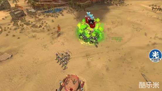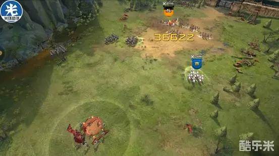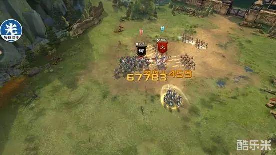 在左路放置阶梯冲锋的骑兵吸引文丑动作并骗技能,通过一连串的操作后,最终达成以下目的——秒掉两个弓手后,敌方文丑的位置离我们最远,这样曹仁的技能目标可以锁定文丑!