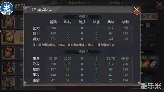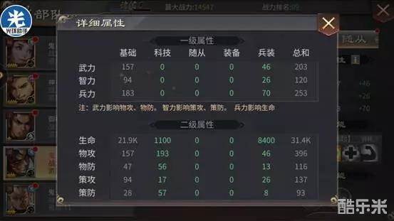 4、其中一个作为牵制的骑兵必须有一定的血量和物防,另两个无所谓,随便上个1级的就行,在本次演练中,属性如下——31.4K兵力116物防,稍微给一下武力和兵力随从就行